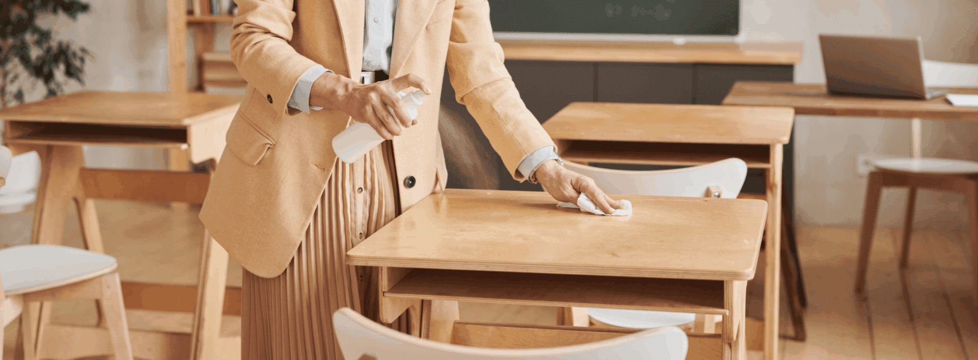 - Disinfecting desks, chairs, and whiteboards